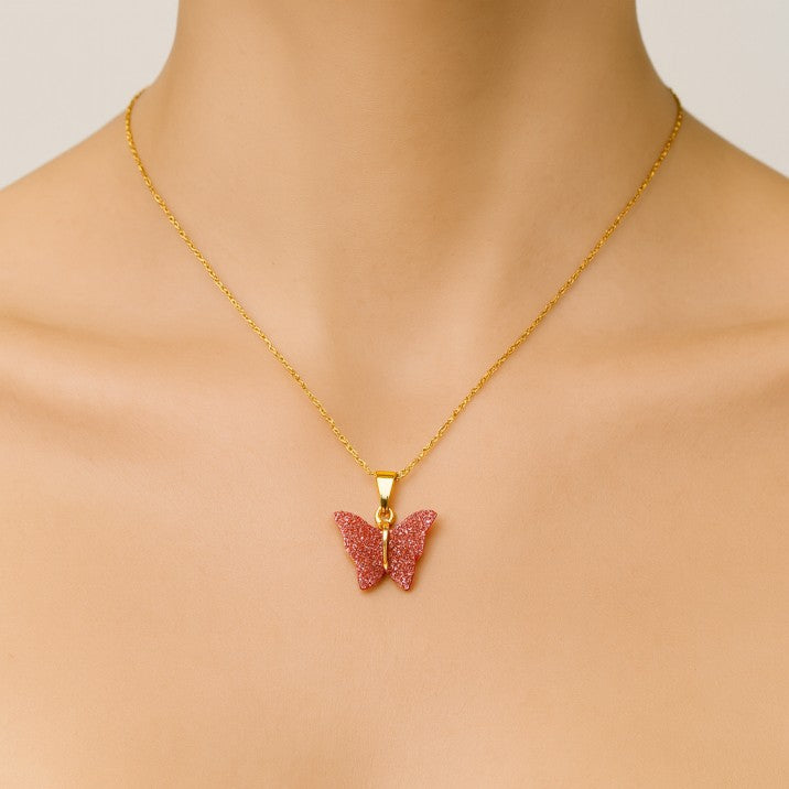 - Includes: Pink butterfly pendant + matching golden chain.
