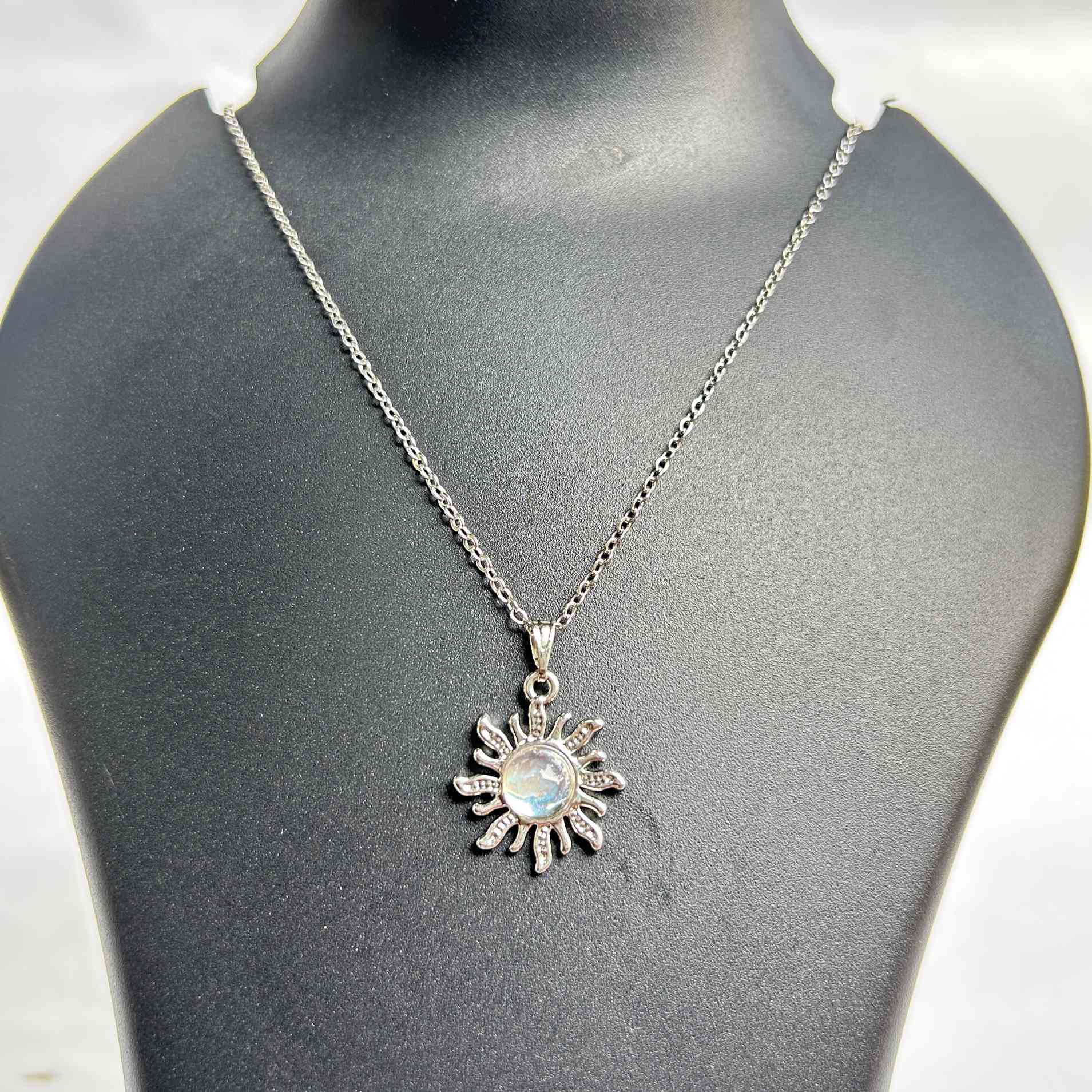 - Materials: Silver-tone alloy pendant with moonstone-like glass/resin center; stainless steel chain.