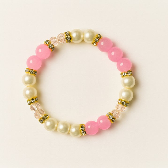 A charming handmade beaded bracelet featuring soft pink beads, glossy pearls, and sparkling rhinestone spacers — carefully crafted to add a touch of elegance and love to every outfit.