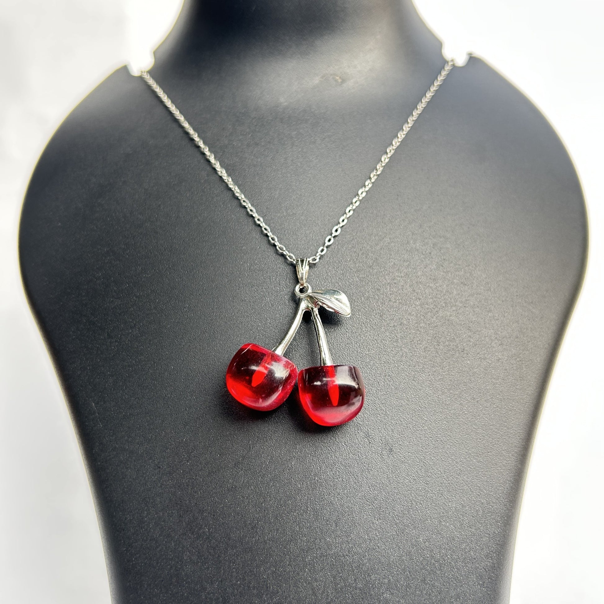 - Adorable cherry-shaped glass pendant with a silver-tone stem and leaf design.
