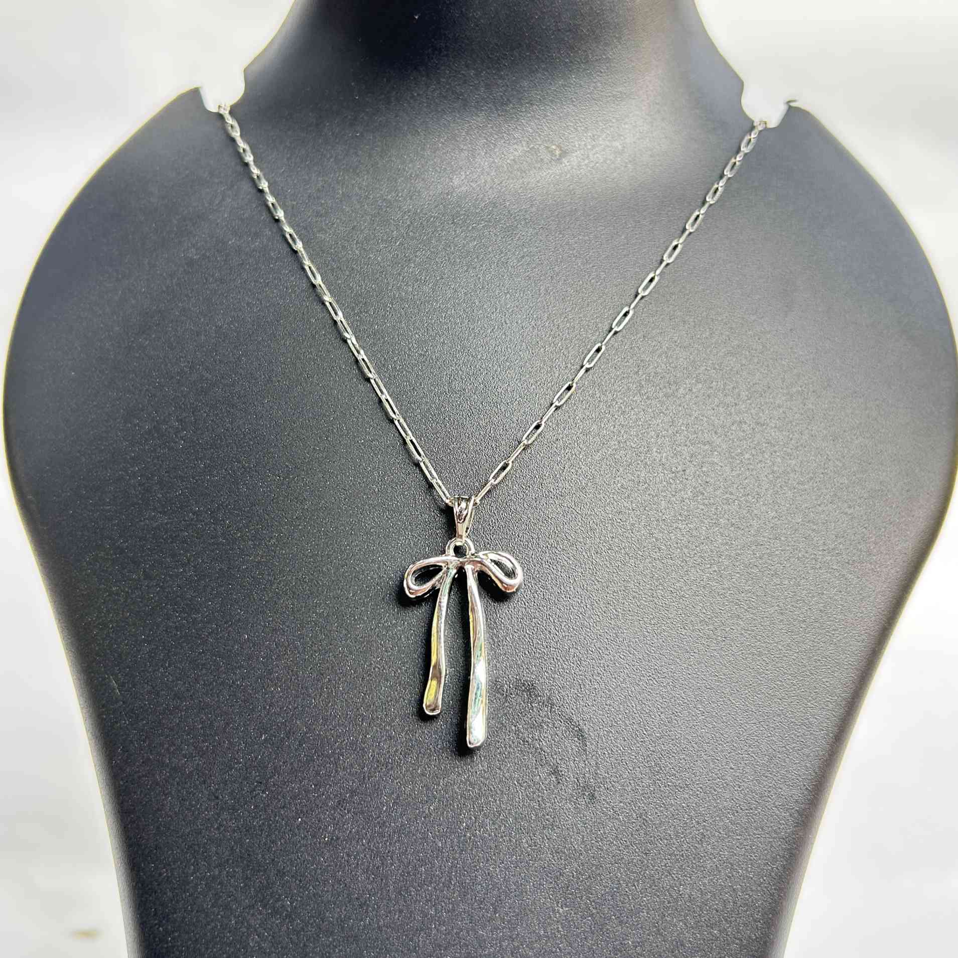 The Silver Long Ribbon Bow Pendant Necklace is a delicate, feminine piece that brings graceful movement to any outfit. A flowing ribbon-style bow with elongated tails hangs from a fine silver chain — a subtle statement that’s perfect for everyday elegance and special moments alike.