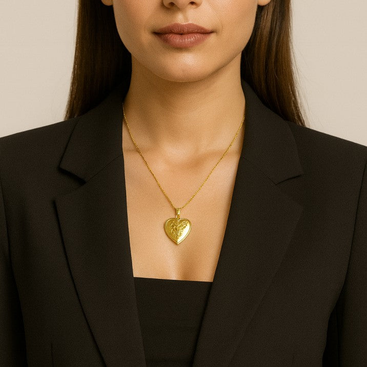 A classic gold heart locket pendant with intricate floral engraving — an elegant keepsake that holds memories close and adds instant vintage charm to any outfit.